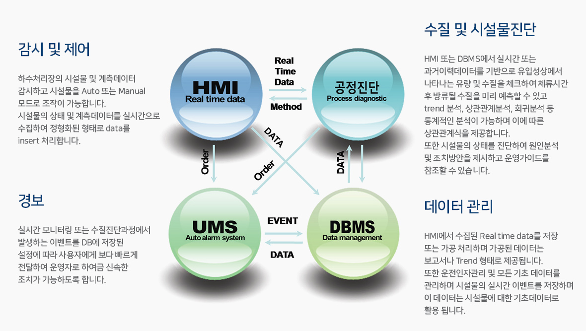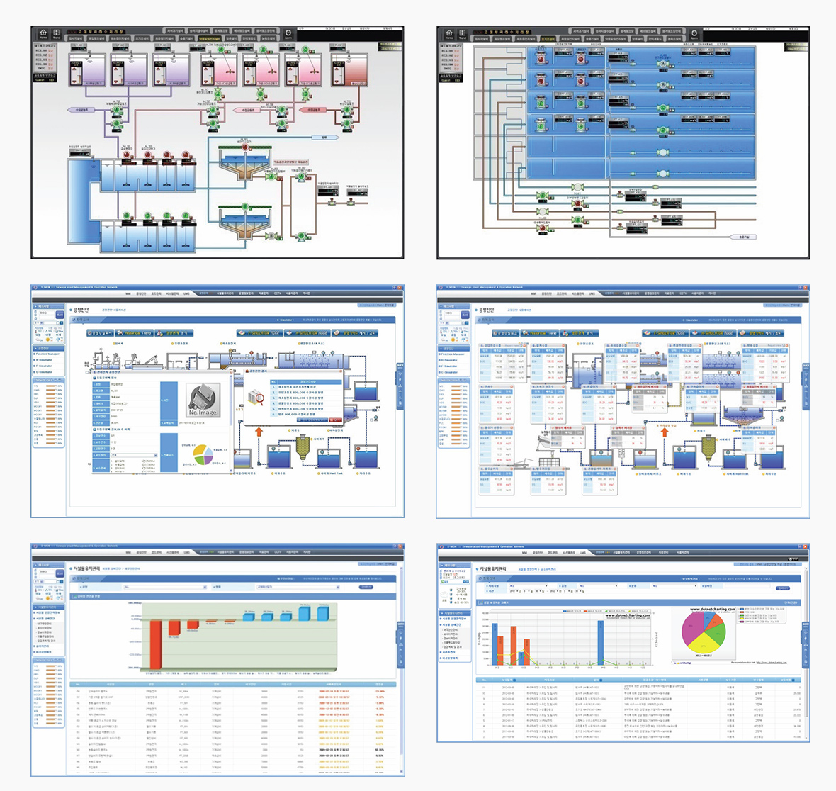 일반적인 산업용 제반설비에 관한 계측, 일괄감시, 제어에 사용되는 원방감시제어장치로 특히, 상하수도 관련 제어반으로부터 측정된 유량, 압력, 적선, 수압, 펌프상태 등 외부 데이터를 원격감시제어반의 중앙처리 장치 및 LTE모뎀 그리고, 내외부 프로그램에 의해서 처리 및 분석하여 그와 연결된 외부기기들을 감시 및 제어 기능이 장점인 상하수도 통합감시용 관망 원격(원방) 계측제어시스템입니다.