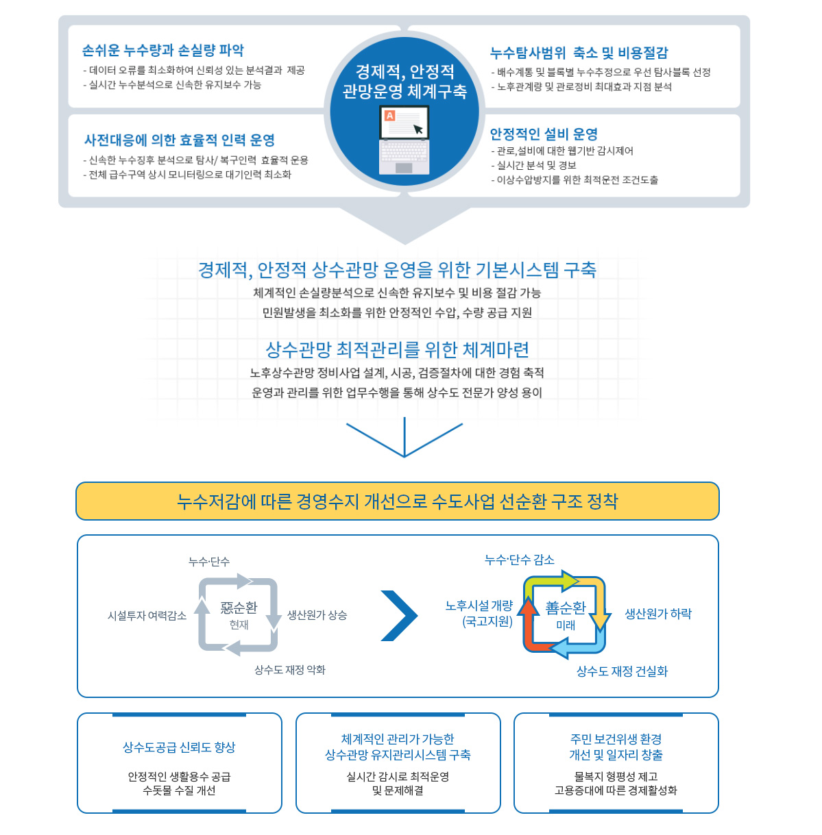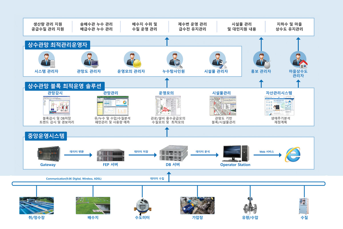 상수도 관망 블록 최적관리시스템은 다양한 계측정보를 효과적인 데이터통신을 통해 수집하고 전문 분석시스템을 통해 분석, 관리하여 상수도 운영자의 의사결정과 유지관리 업무를 지원해 줍니다.
